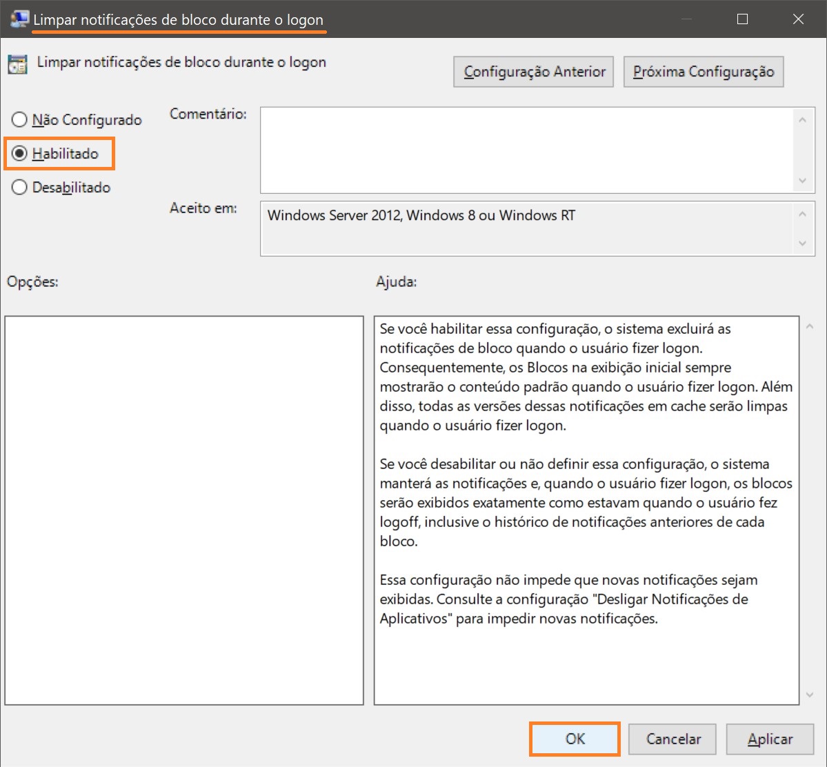 Na janela Limpar notificações de bloco durante o logon, altere a opção de Não configurado para Habilitado e clique no botão OK.