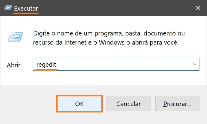 Pressione a combinação de teclas Win + R. Na janela Executar que será aberta, digite o comando regedit e clique em OK.