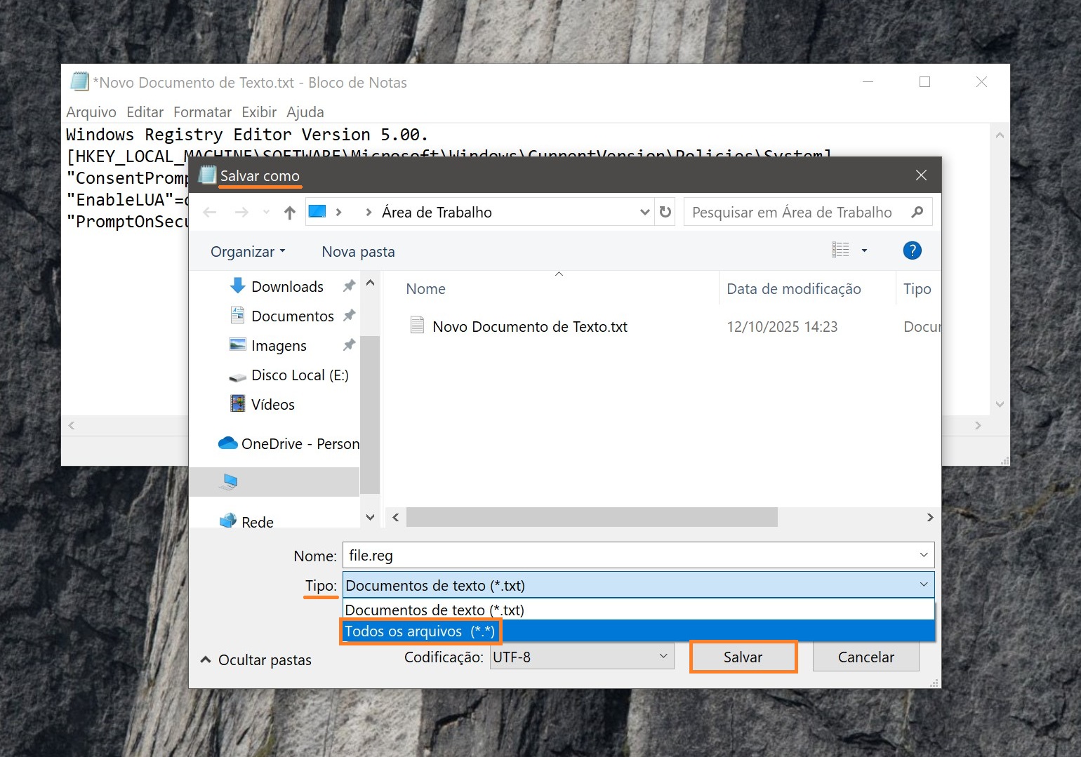 No menu Arquivo, selecione Salvar como… (CTRL+Shift+S). No campo Tipo, escolha Todos os arquivos, indique o local onde deseja salvar e, no nome do arquivo, adicione a extensão .reg.