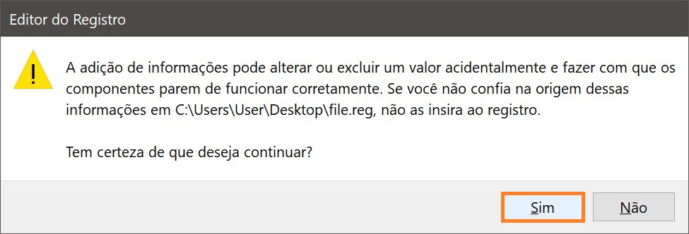 Depois que o arquivo for salvo, você poderá adicionar seu conteúdo ao Registro. Basta dar um duplo clique sobre ele com o botão esquerdo do mouse e confirmar a intenção de fazer alterações no Registro clicando em Sim.