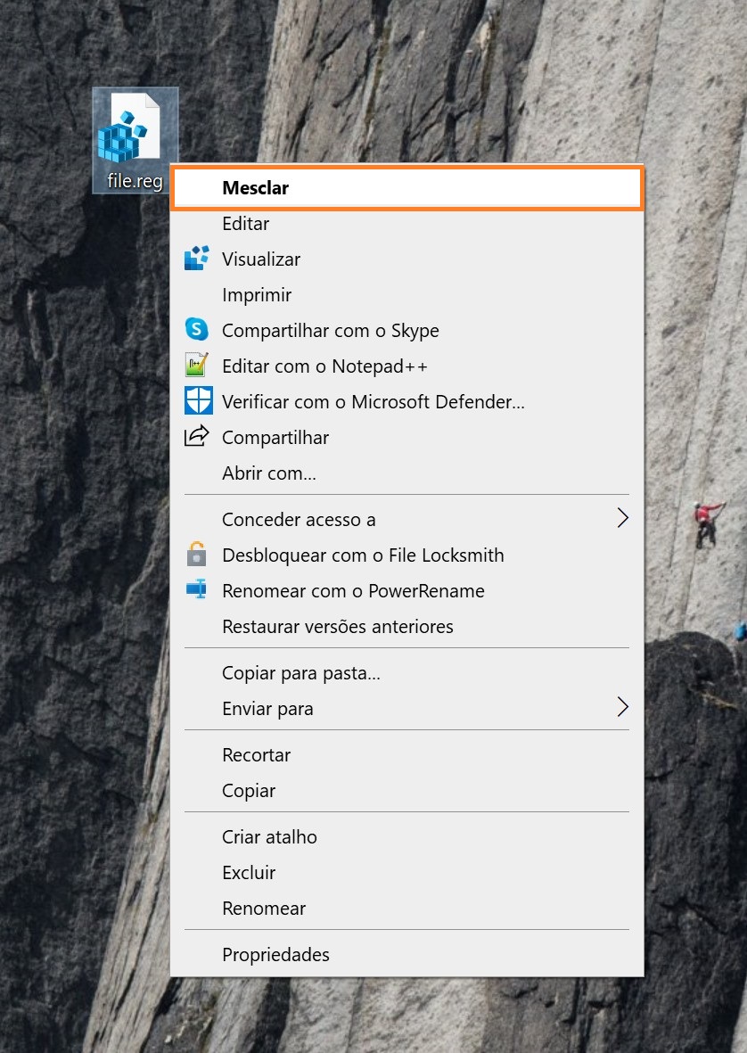 Outra opção é clicar com o botão direito do mouse no arquivo .reg e, no menu de contexto que aparecer, selecionar Mesclar.