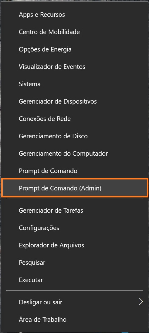 E o quarto método: pressione as teclas Win + X e, no menu de contexto que aparecer, selecione Prompt de Comando (Admin).