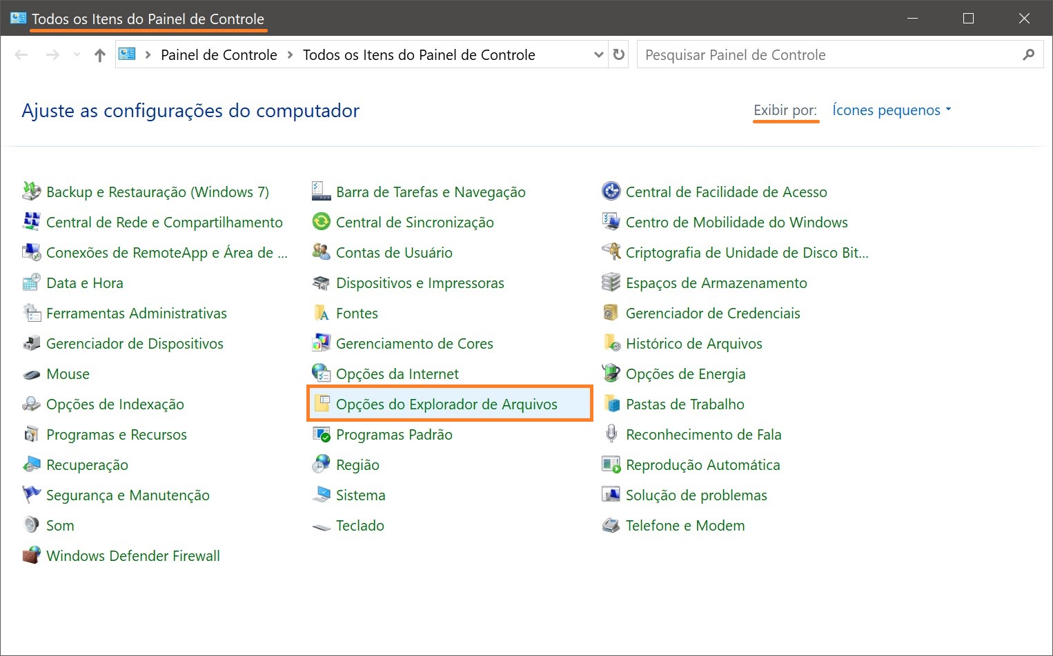 A primeira coisa a fazer é habilitar a exibição das extensões de arquivos, pois, por padrão, o sistema operacional Windows não mostra as extensões. Para isso, abra o Painel de Controle, defina a opção Exibir por: como Ícones pequenos e selecione Opções do Explorador de Arquivos.