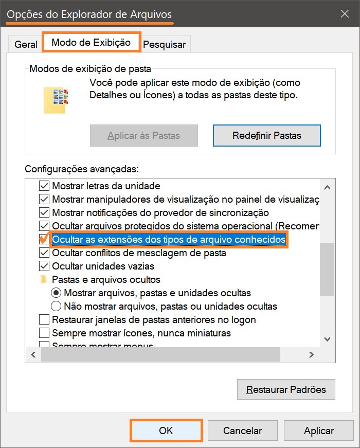 Na janela Opções do Explorador de Arquivos que será aberta, vá até a guia Modo de Exibir e desmarque a opção Ocultar as extensões dos tipos de arquivo conhecidos, depois clique em OK.