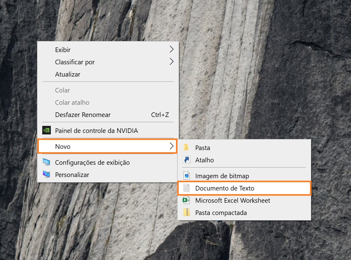 Agora você pode começar a criar o arquivo REG. Para isso, clique com o botão direito do mouse em qualquer área livre da área de trabalho e, no menu de contexto que aparecer, selecione Novo → Documento de Texto.